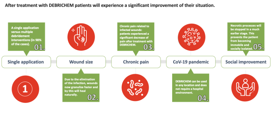 DEBRICHEM® aims to disrupt the treatment of non-healing wounds, by curing the wound rather than treating wounds to maintain the status quo. The cost savings to the system are coming through as in most cases no operation room is required to apply DEBRICHEM® and it is a single application which is applied only once in the majority of cases for the wound to fully granulate within a median of 22 days (Cogo, A et all, Wounds 2021).