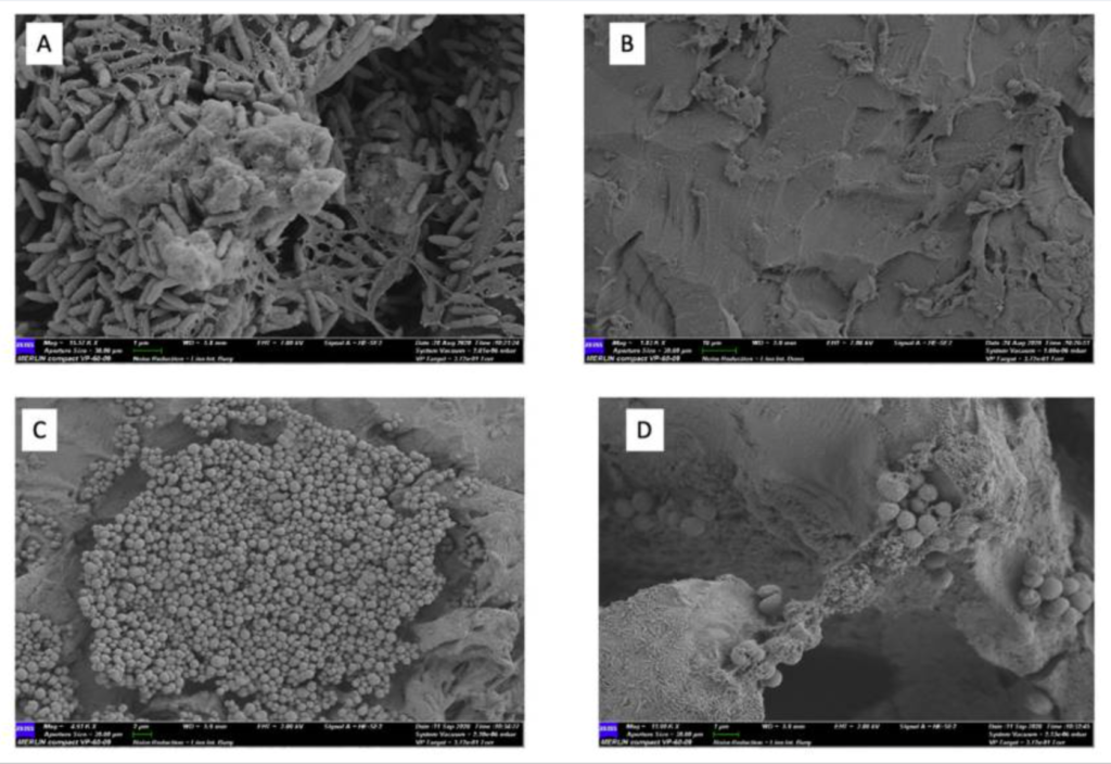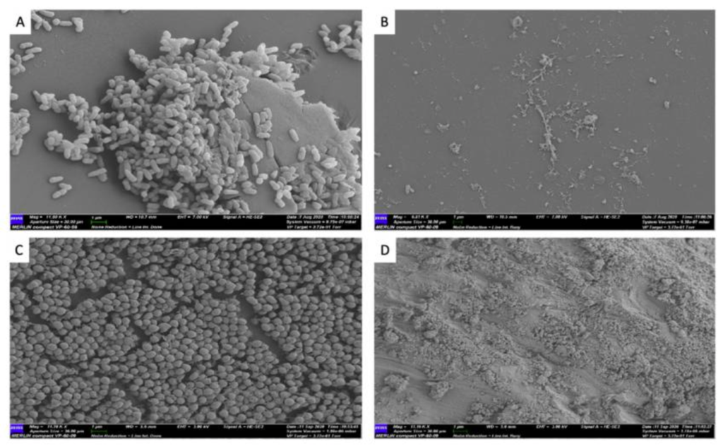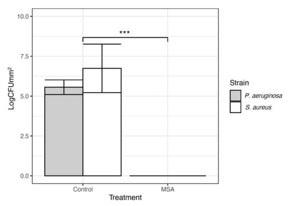 DEBRICHEM® demonstrated complete eradication of viable cells in all models for both strains (p < 0.0001). Imaging with scanning electron microscopy (SEM) was performed where possible. All three models demonstrated complete eradication of viable cells with a 30 s application of a topical wound desiccating agent.
